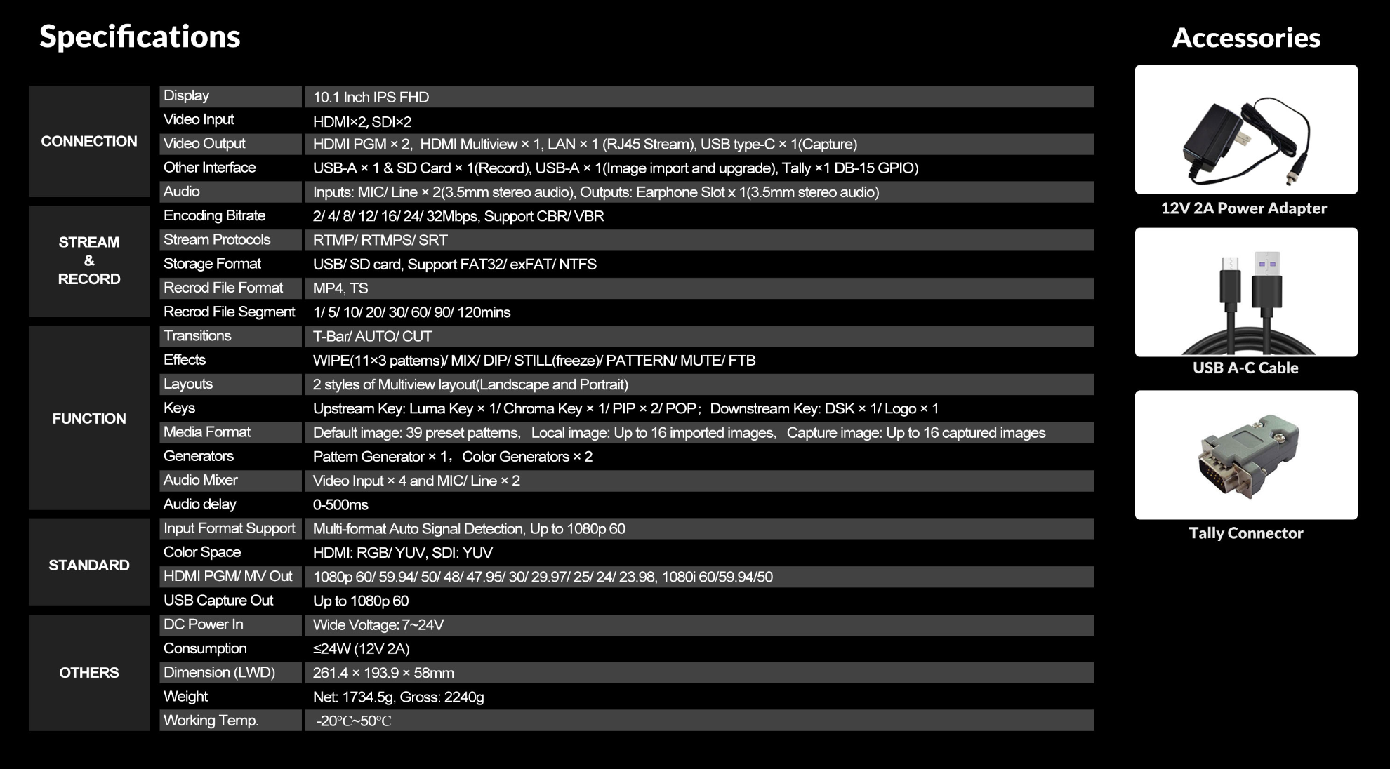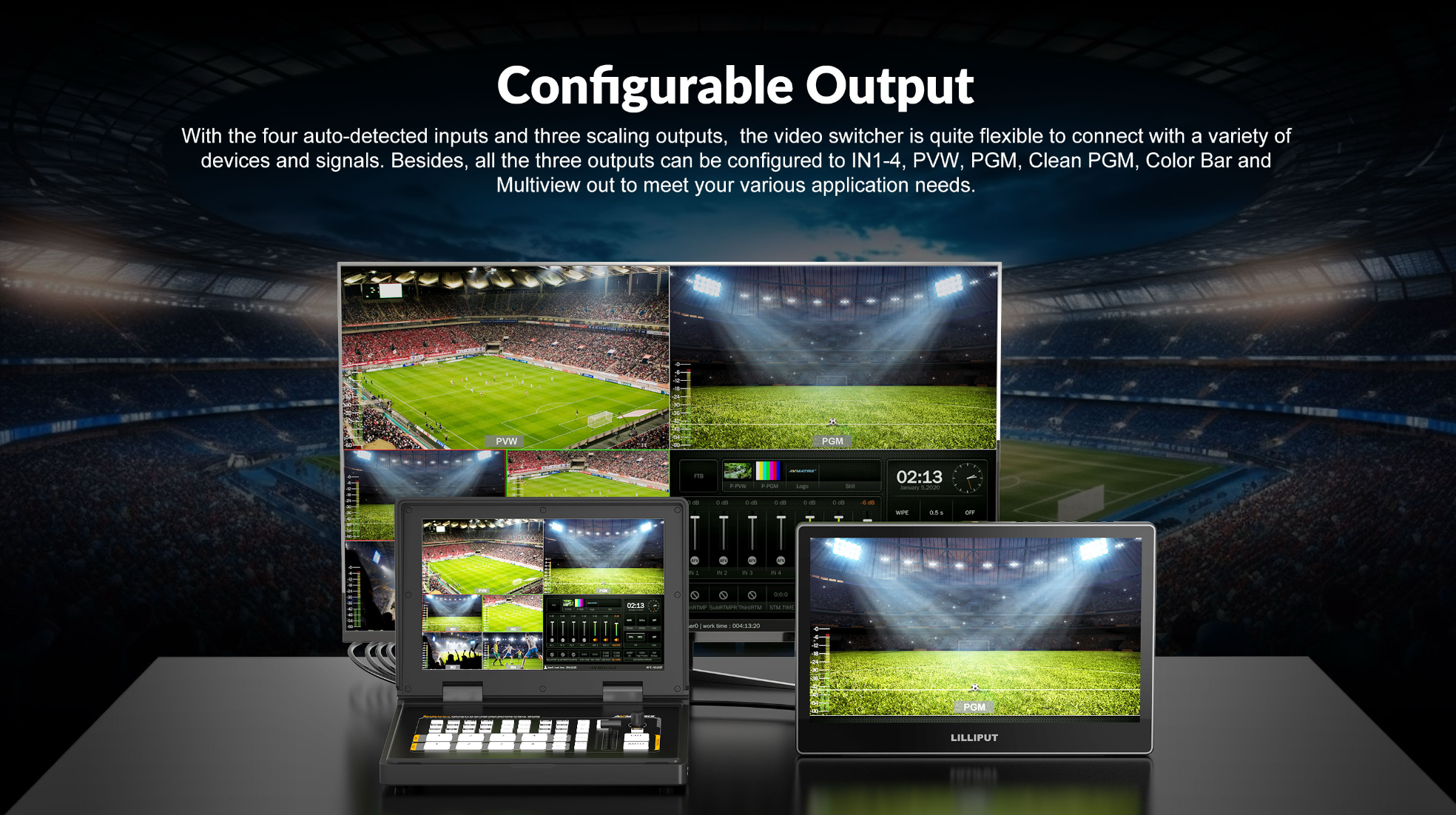 devices and signals. Besides, all the three outputs can be configured to IN1-4, PVW, PGM, Clean PGM, Color Bar and